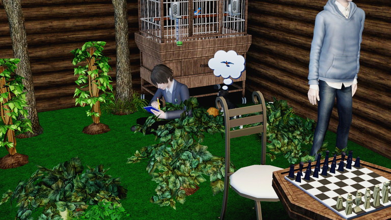 緑の中で宿題。うらやま。小鳥は紫が捕まえたブルーバードです。ピッピッピって声がなかなかいいんだこれまた。
