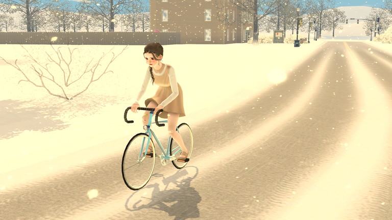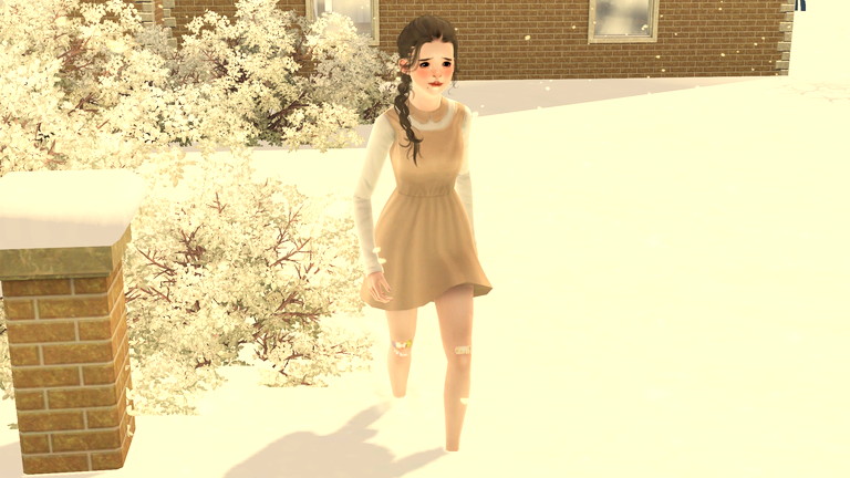 雪が降っていますが、彼女は今寒さなど微塵も感じていません。